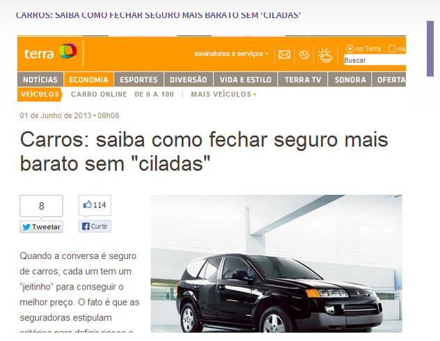 Dias atrás, o portal terra publicou uma matéria/entrevista com uma "corretora de seguros on line", onde dentre outras afirmações, o entrevistado informava que oferecia seguros de automóvel até 40% mais barato que os preços normalmente praticados pelo mercado.