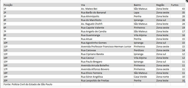 As 20 ruas de São Paulo com maior número de furtos de veículo